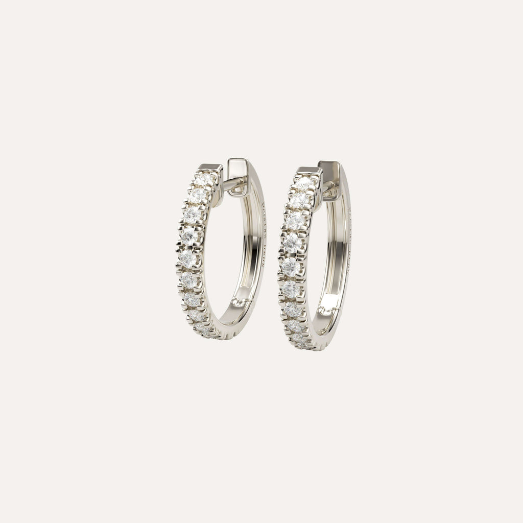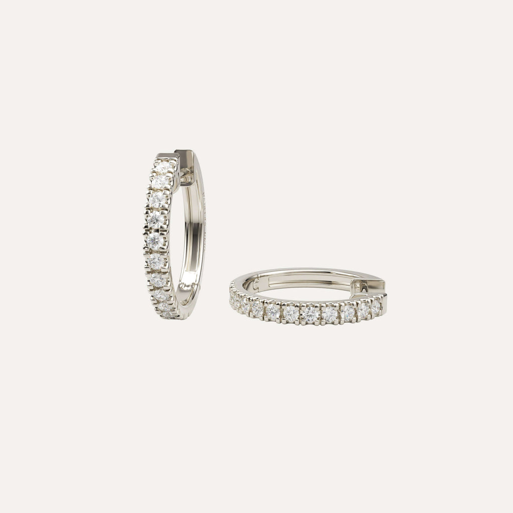 Hoops i 18 karat hvidguld med brillantslebne diamanter. I alt 0,18 carat i kvaliteten Top Wesselton VVS. Diameter 11 mm. Bredde 1,7 mm.