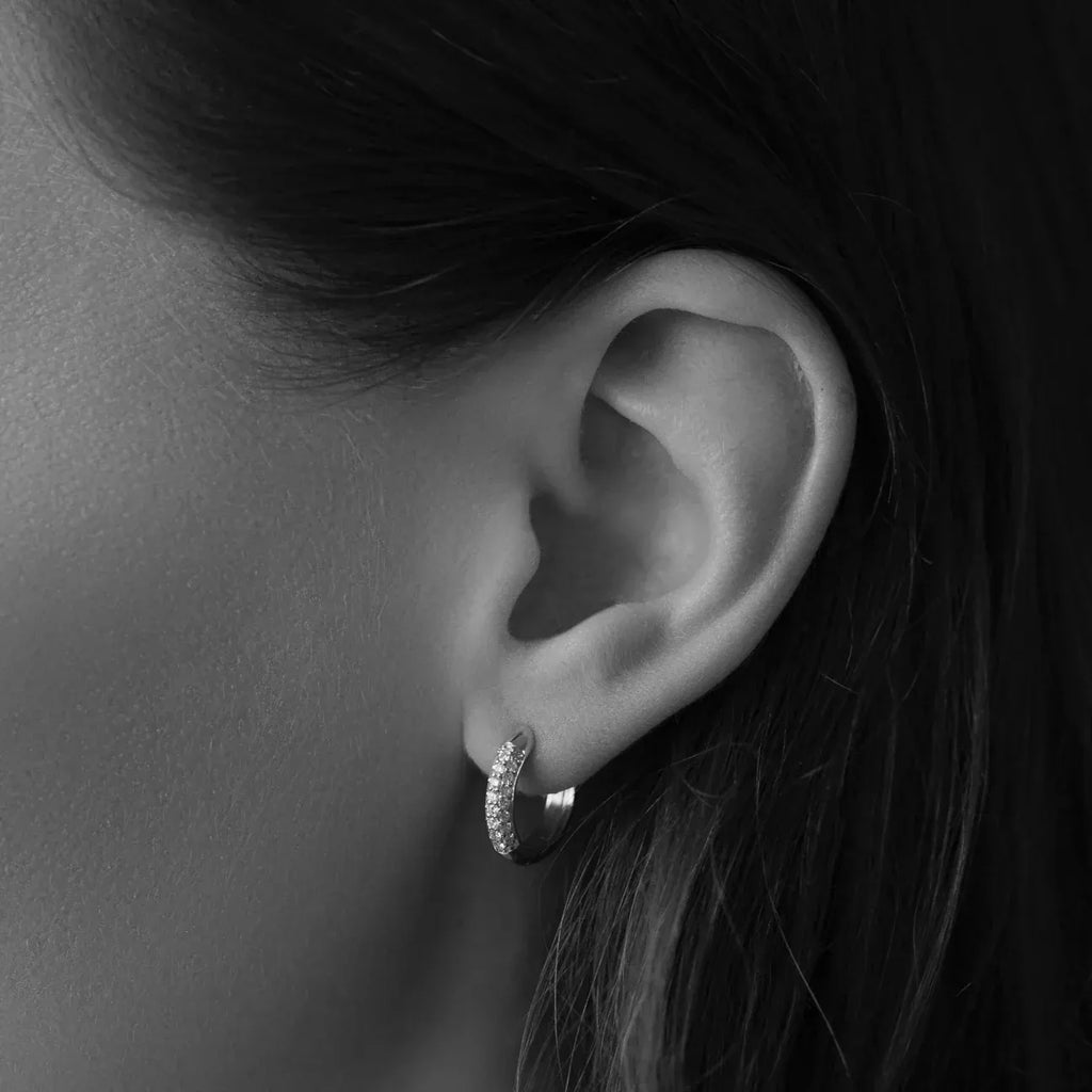 Hoops i 18 karat hvidguld med pavéfattede brillantslebne diamanter. I alt 0,44 carat i kvaliteten Top Wesselton VVS pr. par. Diameter 12 mm. Bredde 3 mm.