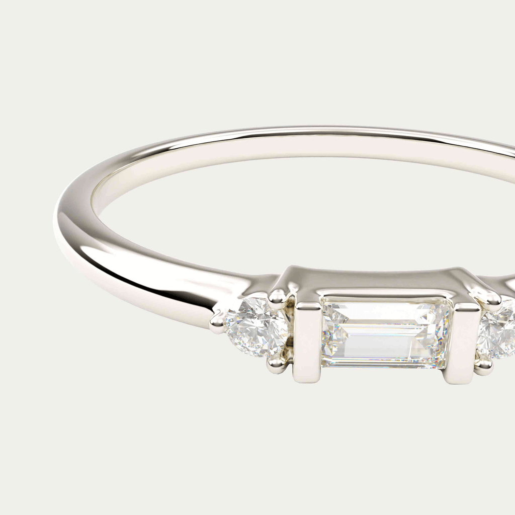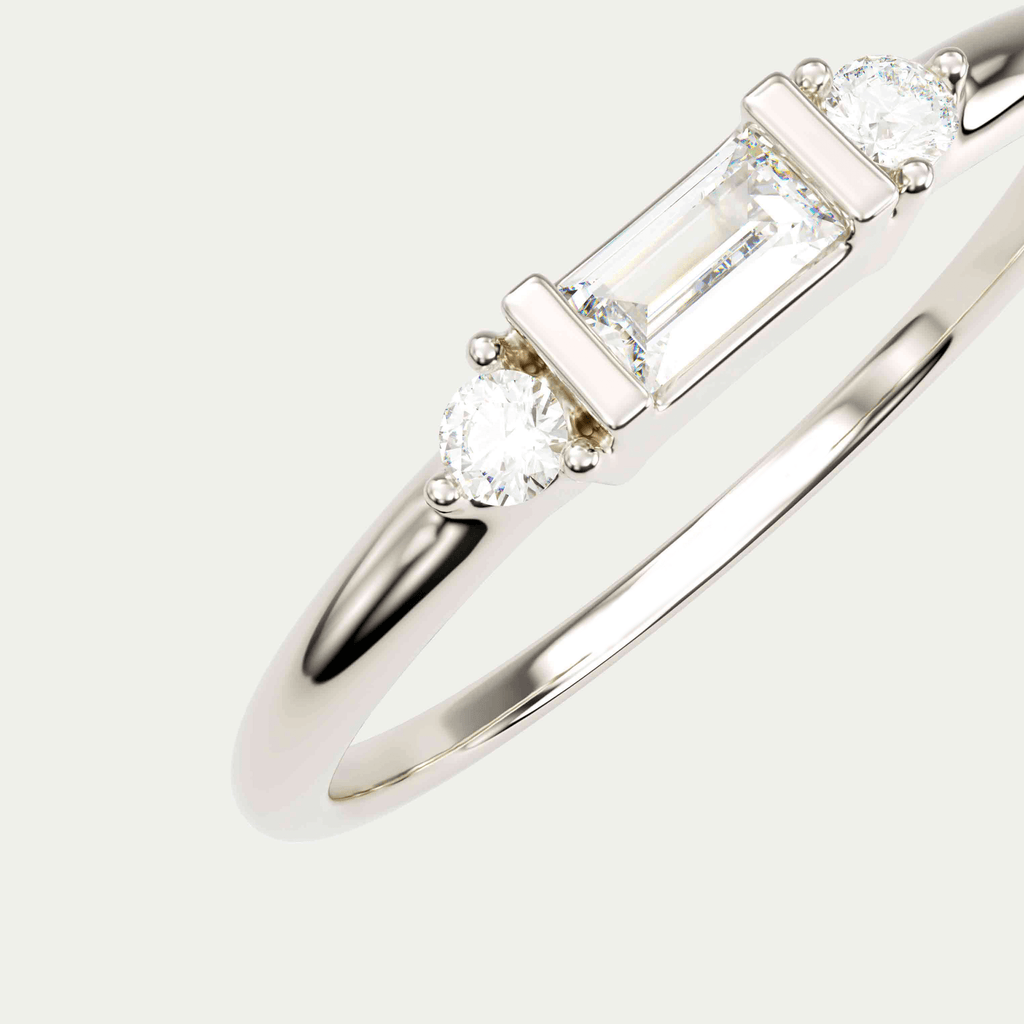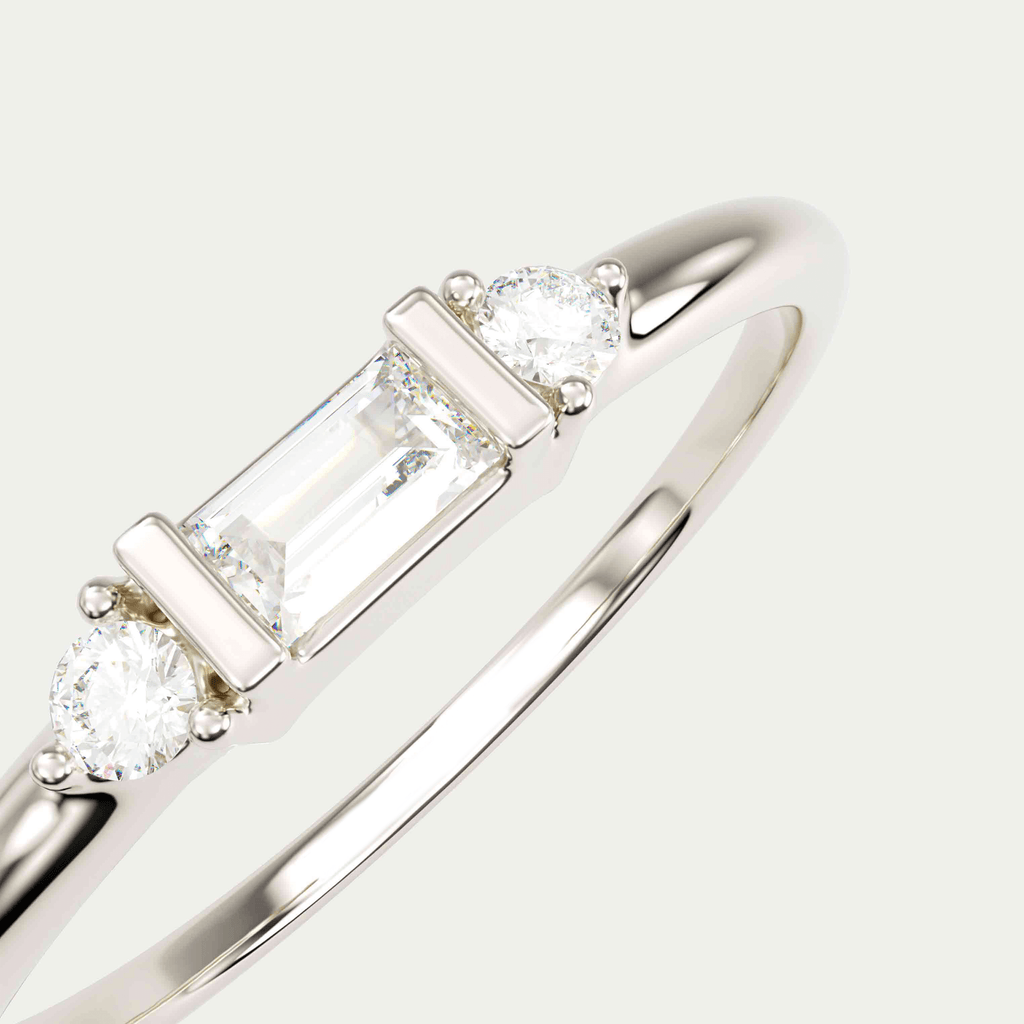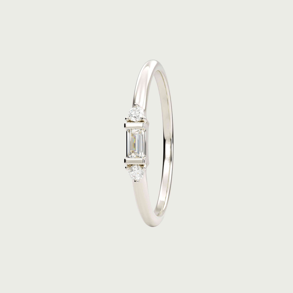 Ring i 18 karat hvidguld med en baguettesleben diamant og to brillantslebne diamanter. I alt 0,10 carat i kvaliteten Top Wesselton VVS.
