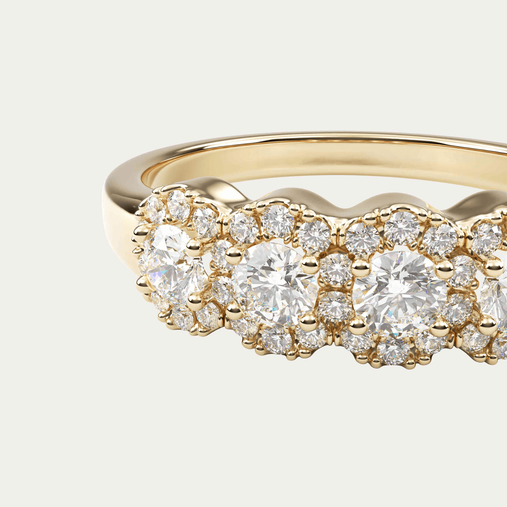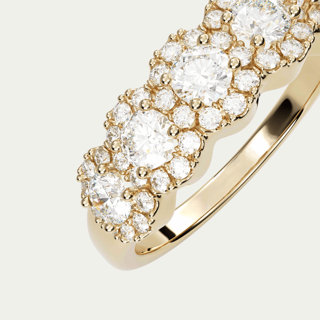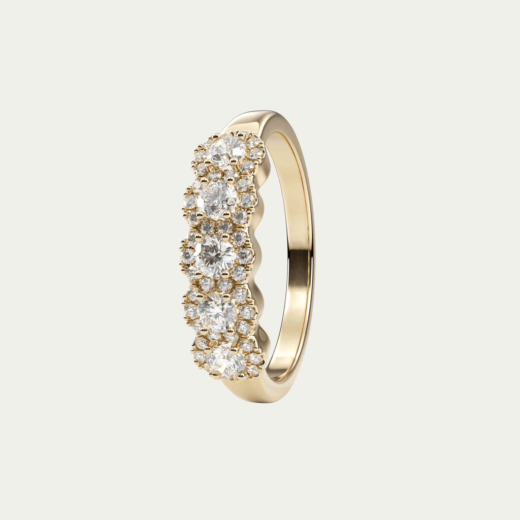 Ring i 18 karat guld med fem brillantslebne diamanter på 0,08 carat hver, omkranset af en halo af mindre diamanter. I alt 0,65 carat i kvaliteten Top Wesselton VVS.